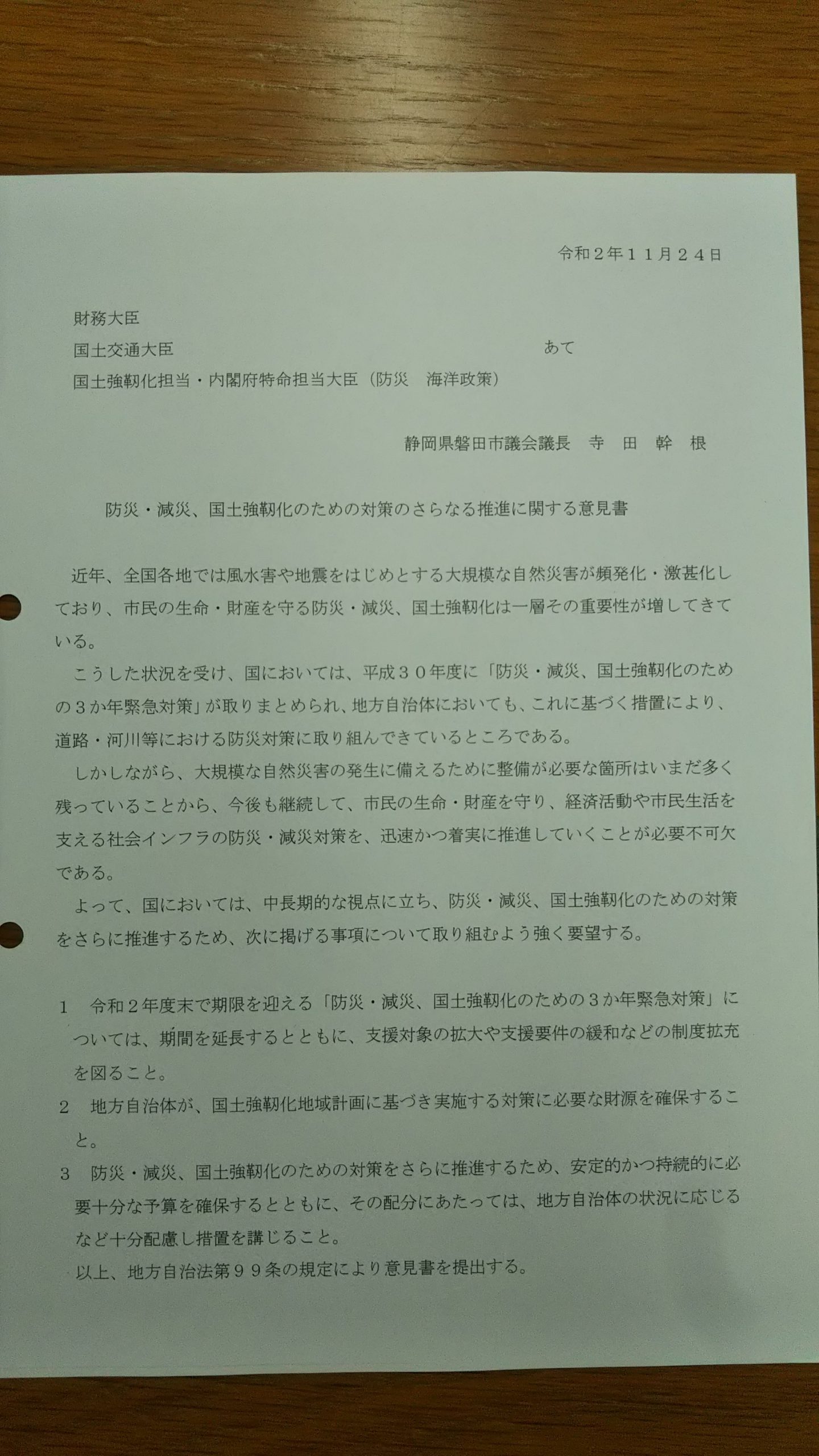 防災・減災、国土強靭化のための対策のさらなる推進に関する意見書
